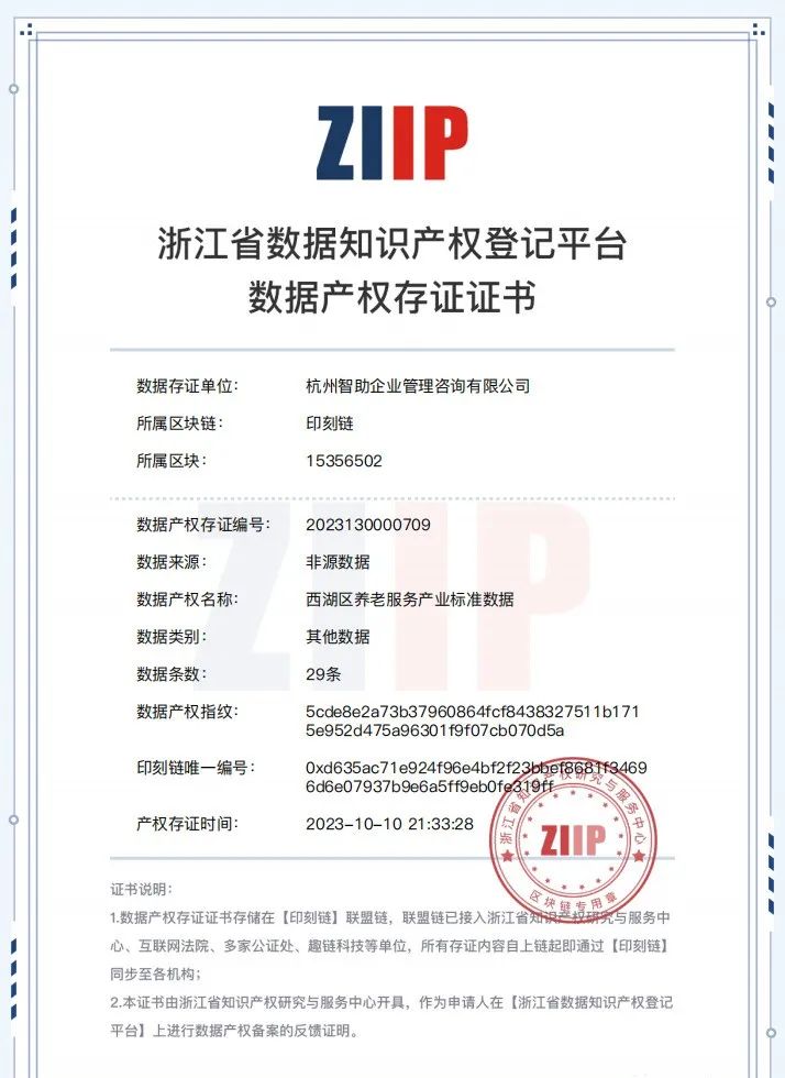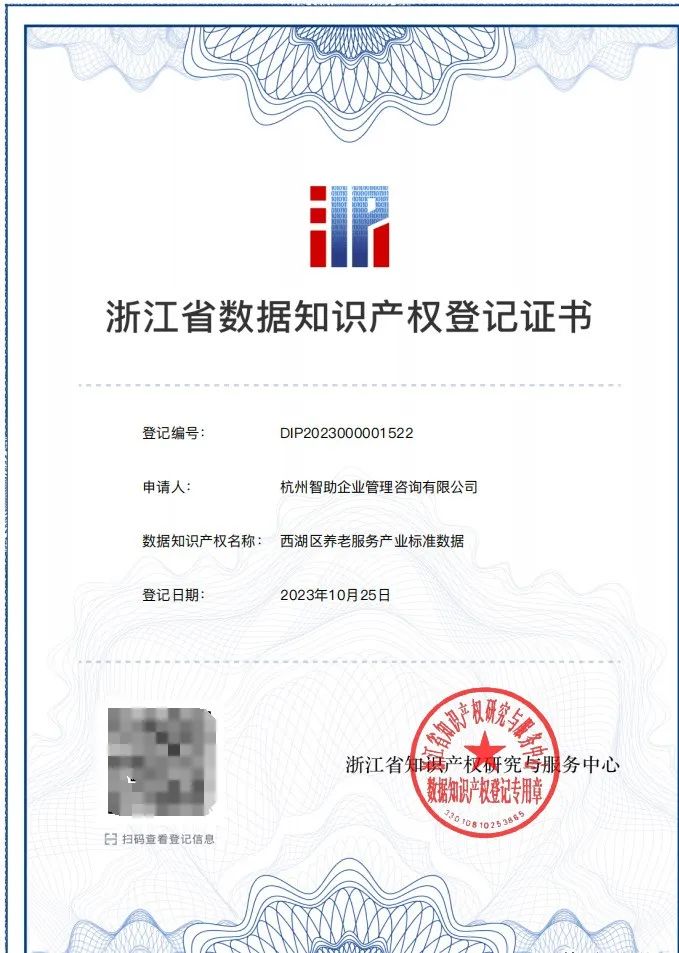 近日,智助咨询申报的“西湖区养老服务产业标准数据”成功通过浙江省数据知识产权登记审核,标志着智助咨询在产业标准数据的培育、运用及保护方面迈出了重要一步。