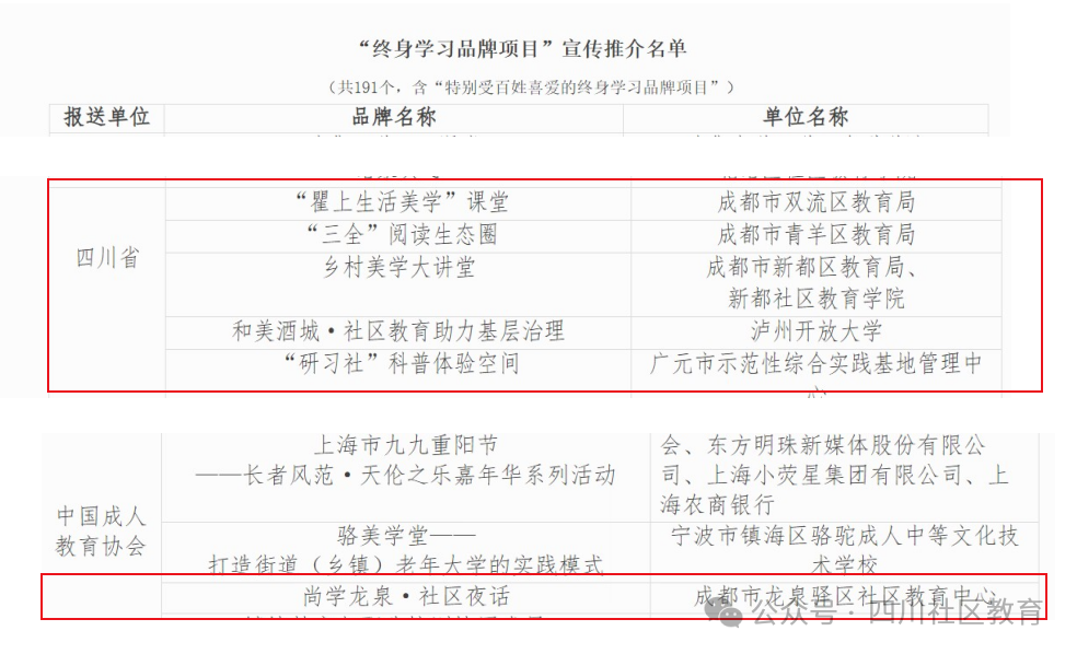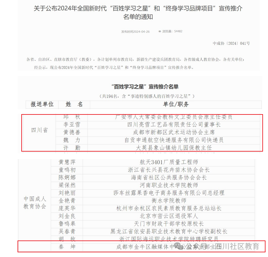 近日,全国全民终身学习活动周领导小组公布了2024年全国新时代“百姓学习之星”和“终身学习品牌项目”推介名单。由我省推介的广安市邱秋等6人被评为2024年全国新时代“百姓学习之星”,成都市双流区的“瞿上生活美学”课堂等6项品牌被评为2024年全国新时代“终身学习品牌项目”。