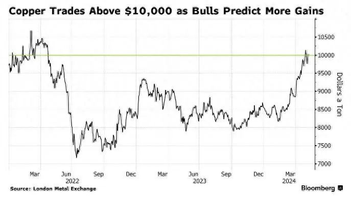 他们认为,尽管短期内铜价可能出现盘整,但供需短缺的大背景下,铜价上涨的趋势仍将持续。因此,他们将年底铜的目标价格上调至1.2万美元/吨,并预计2025年铜的平均价格将达到1.5万美元/吨。