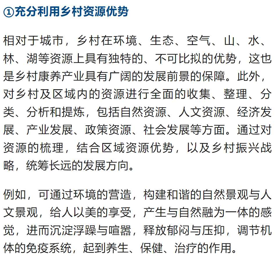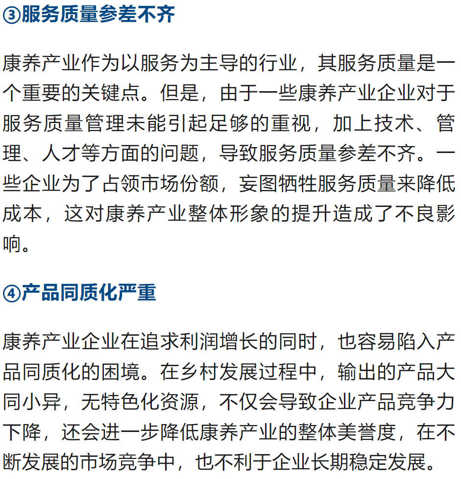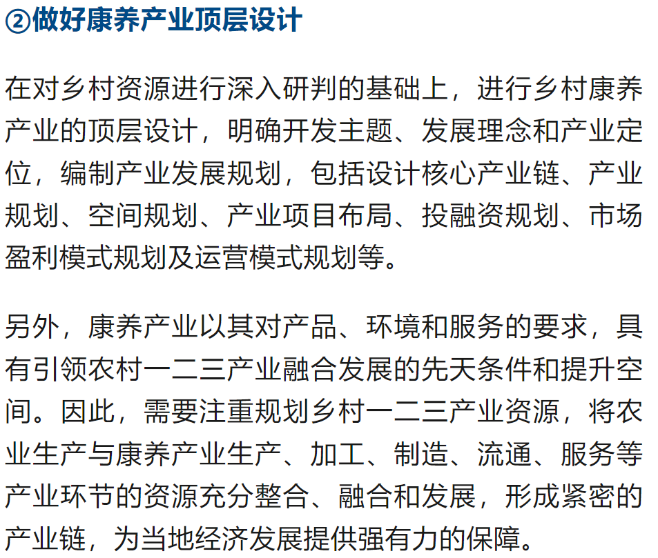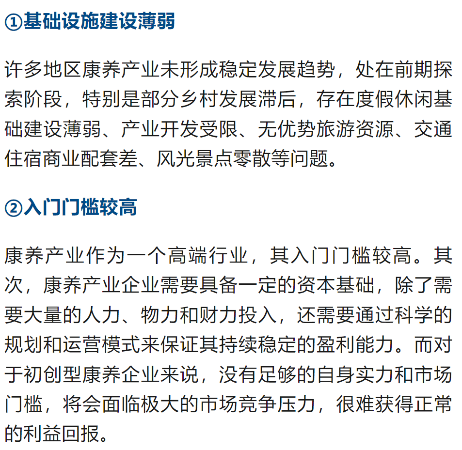 紧抓生态康养、休闲旅游、养生保健市场等热度,克服管理领域、技术领域、人才资源等问题,注重品牌建设和服务质量的提高,积极寻找创新发展的突破口,通过推动产业的全面升级,促进康养产业健康有序发展。