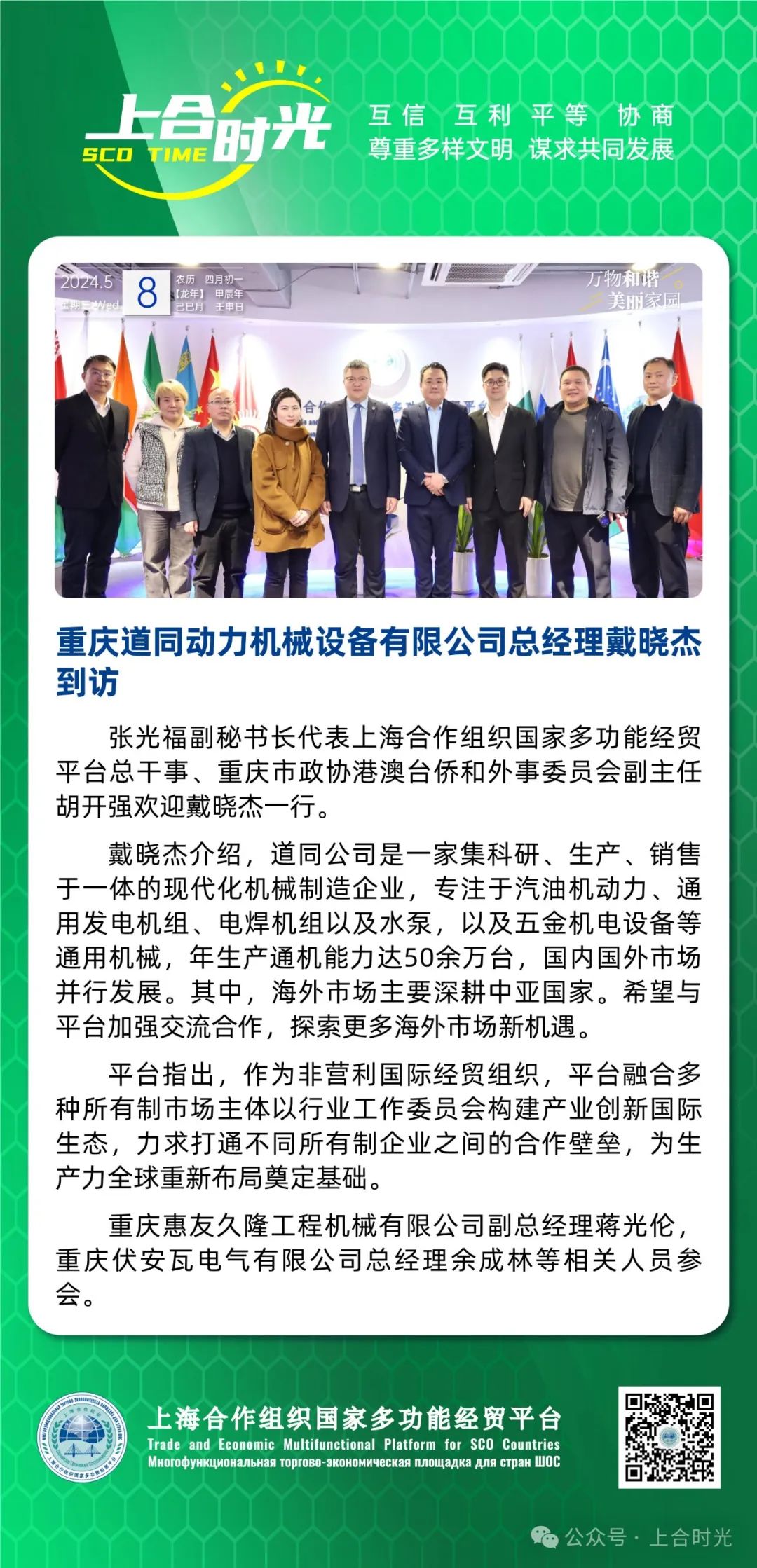 戴晓杰介绍,道同公司是一家集科研、生产、销售于一体的现代化机械制造企业,专注于汽油机动力、通用发电机组、电焊机组以及水泵,以及五金机电设备等通用机械,年生产通机能力达50余万台,国内国外市场并行发展。其中,海外市场主要深耕中亚国家。希望与平台加强交流合作,探索更多海外市场新机遇。