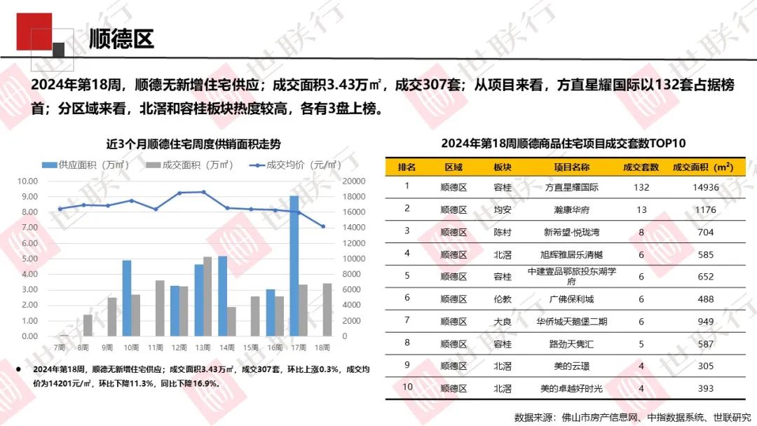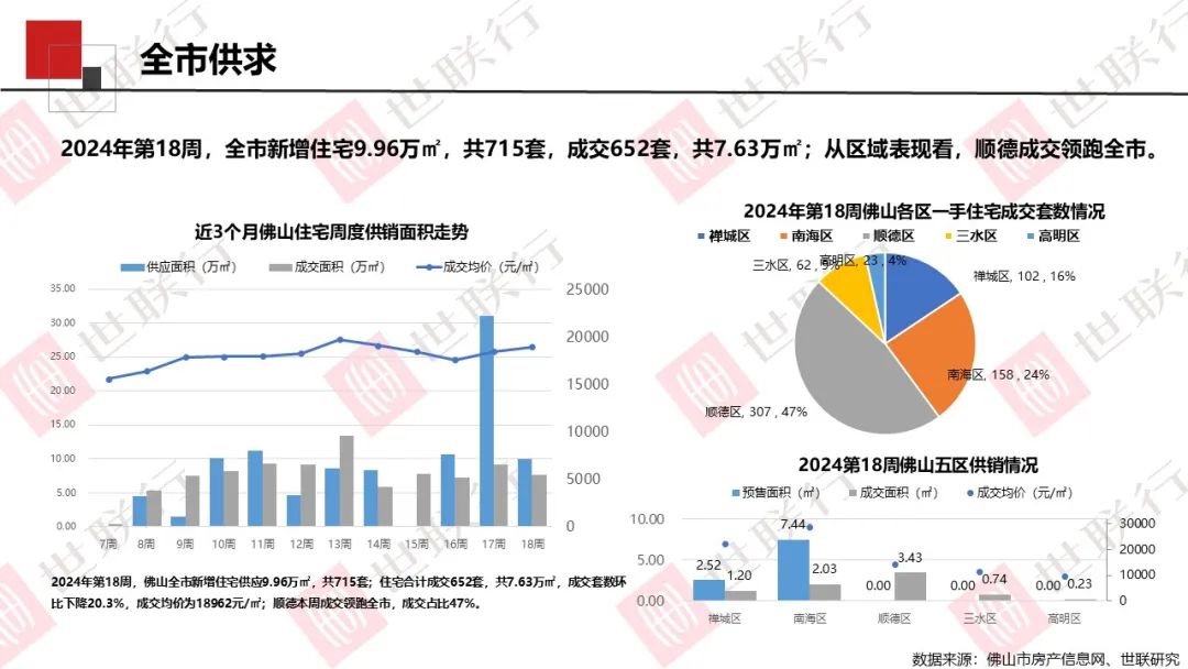 2024年第18周,全市新增住宅9.96万㎡,共715套,成交652套,共7.63万㎡;从区域表现看,顺德成交领跑全市。