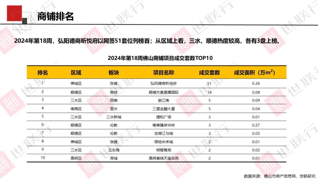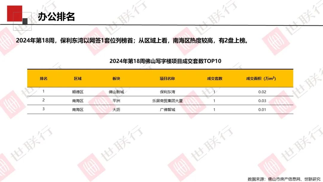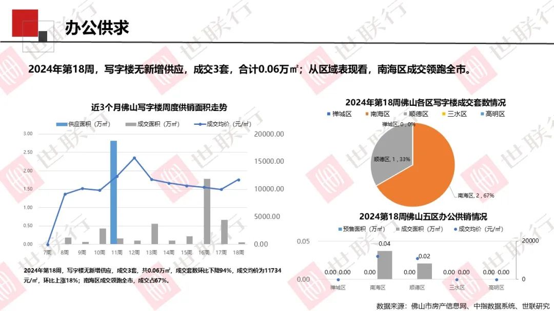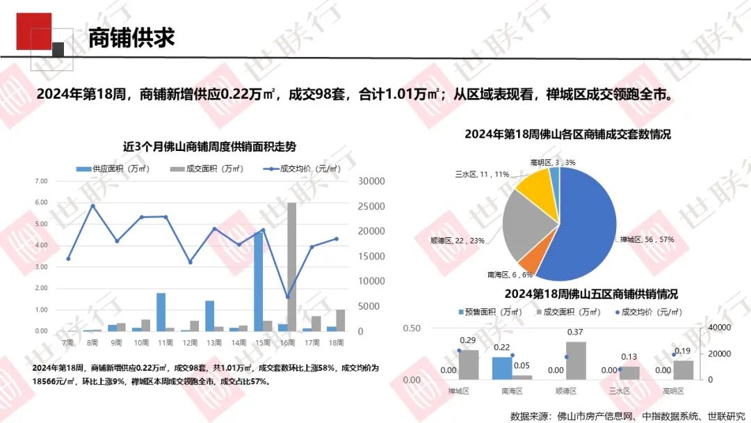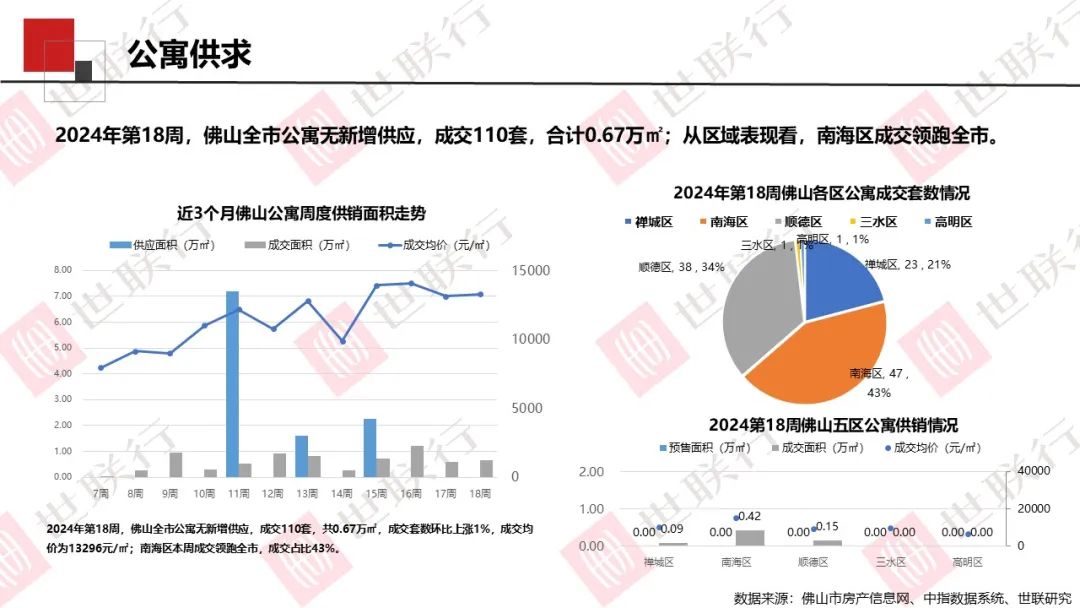 第18周,佛山全市公寓无新增供应,成交110套,合计0.67万㎡;商铺新增供应0.22万㎡,成交98套,合计1.01万㎡;写字楼无新增供应,成交3套,合计0.06万㎡。
