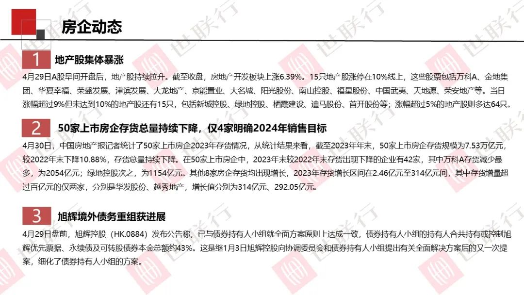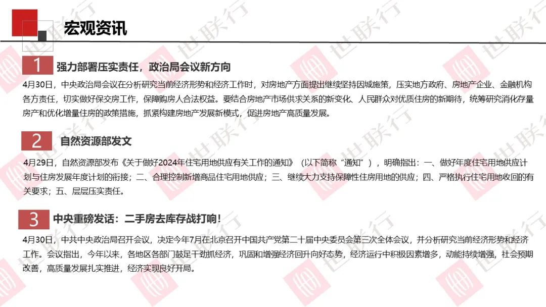 4月30日,中央政治局会议在分析研究当前经济形势和经济工作时,对房地产方面提出继续坚持因城施策,压实地方政府、房地产企业、金融机构各方责任,切实做好保交房工作,保障购房人合法权益。要结合房地产市场供求关系的新变化、人民群众对优质住房的新期待,统筹研究消化存量房产和优化增量住房的政策措施,抓紧构建房地产发展新模式,促进房地产高质量发展。