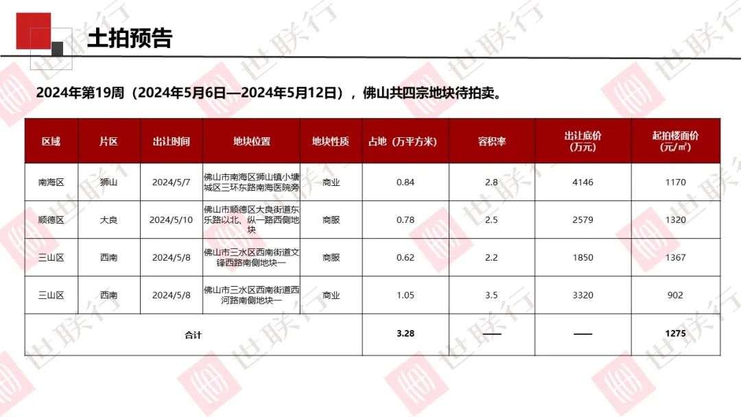 2024年第18周,佛山新增1宗商住用地,无地块成交。第19周(2024年5月6日—2024年5月12日),共四宗地块待拍卖。