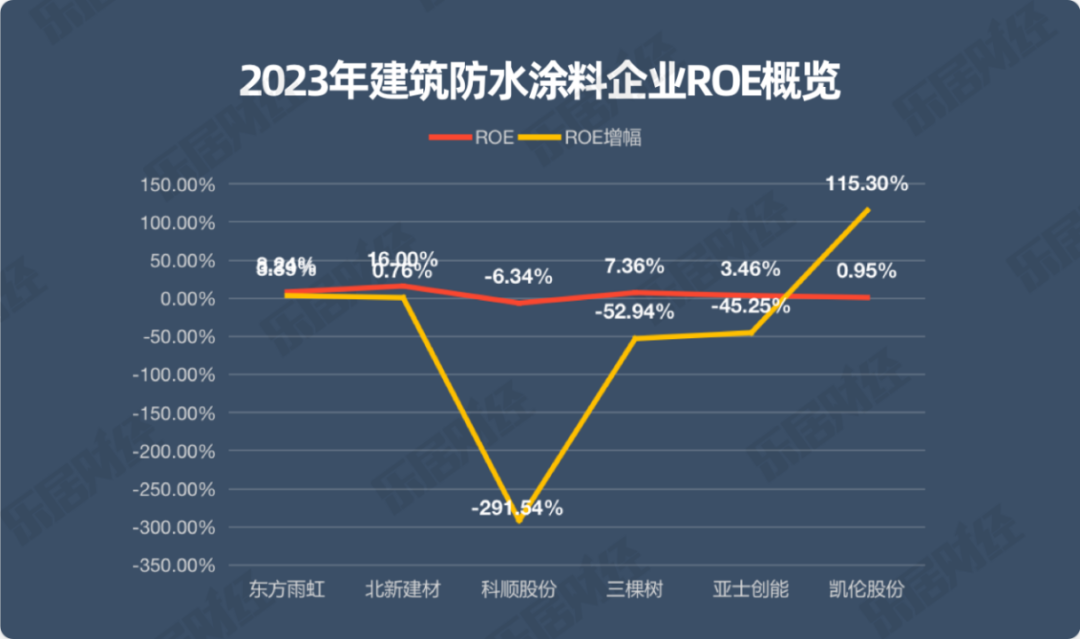 从净利率来看,6家公司中,仅科顺股份的净利率是负值,为-4.31%。东方雨虹、凯伦股份、北新建材三家企业的净利率出现增长,其中净利率最高的是北新建材,为15.85%。净利率增幅最大的为凯伦股份,去年其净利率为-7.58%,今年则为1.02%。三棵树和亚士创能的净利率出现下滑,分别为1.42%、1.93%。