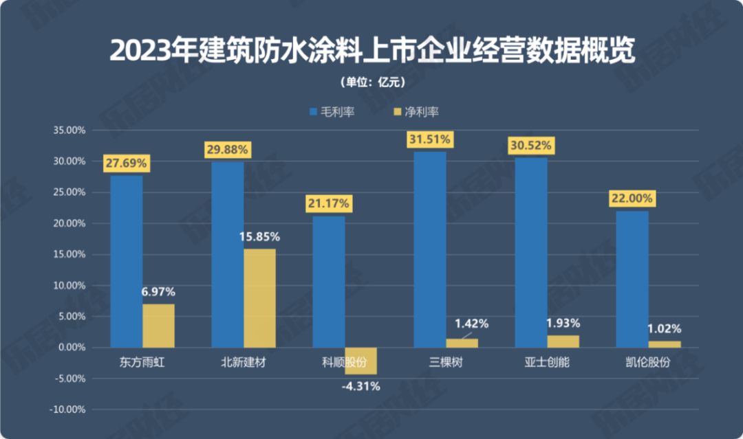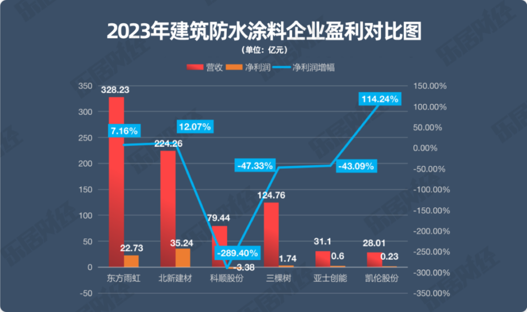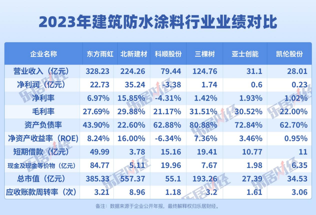 近日,乐居财经对6家已上市建筑防水涂料企业:东方雨虹、北新建材、科顺股份、三棵树、亚士创能、凯伦股份,多个维度分析其2023年年报。