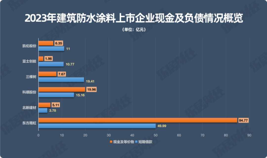 同期,三棵树、亚士创能和凯伦股份的短期借款为19.41亿元、10.77亿元、11亿元,企业的在手现金数额不足以覆盖短期借款,偿债压力大。