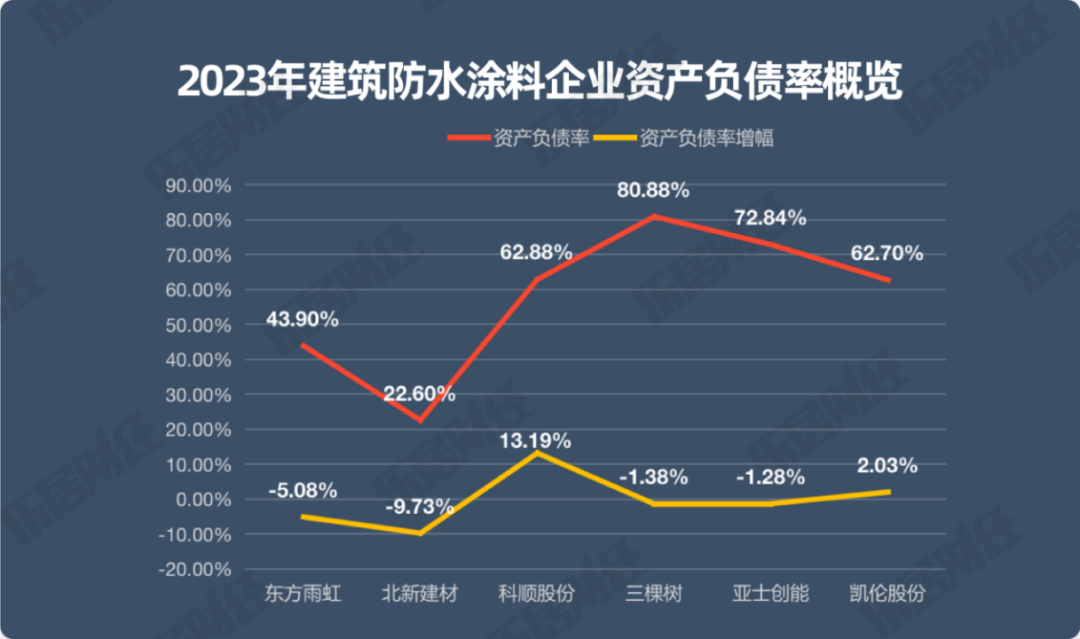 在防水涂料行业,分化较为明显的还有资产负债率指标。在乐居财经统计的6家企业中,有4家企业的负债率超过60%。其中三棵树的资产负债率最高,为80.88%。其次是亚士创能,为72.84%。