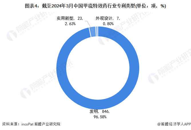 在专利类型方面,目前全球有846项甲流特效药专利为发明专利,占中国甲流特效药专利申请数量最多,为96.58%。实用新型甲流特效药专利和外观设计型甲流特效药专利数量分别为23项和7项。