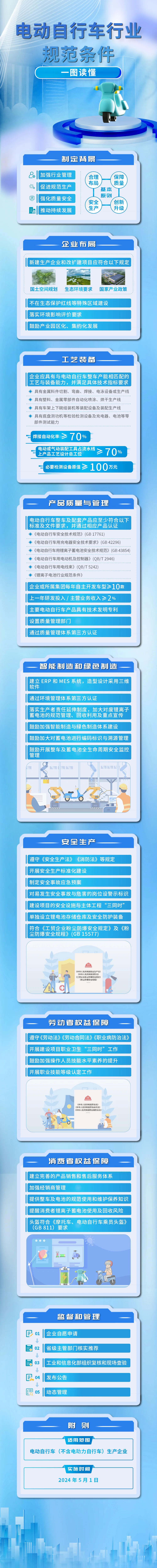 《规范条件》从五方面强化了电动自行车行业的安全生产水平。一是大力推动智能制造建设,提升安全保障水平和资源配置效率;二是鼓励开展对电动自行车及蓄电池全生命周期安全监控管理;三是要求企业严格遵守相关法律法规,配备专业工作人员,建立健全安全生产工作制度;四是机械加工、电池存储等易产生安全事故的岗位应设置警示标识与安全防护装置;五是产生可燃性粉尘工艺的设备设施、除尘系统应满足相关标准。