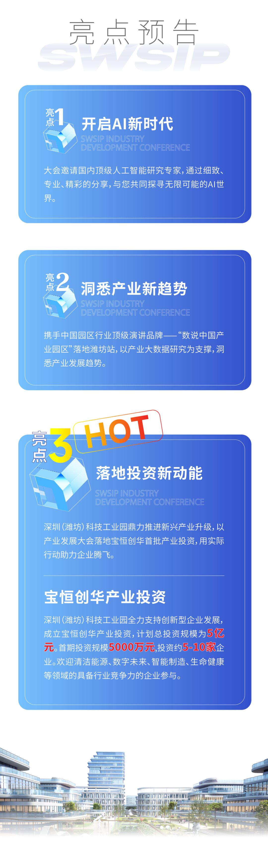 深圳(潍坊)科技工业园作为发展新质生产力先行者,通过一场产业发展大会,邀请有关领导、AI智能专家、产业专家、企业家出席,围绕创新发展进行多元化思维碰撞。同时开展人工智能、数说中国产业园区主题演讲,展现深潍产业投资落地成果。为产业发展提供一个国际化、跨行业、高科技、强专业的顶级发展交流平台,共同发现产业未来发展的新机遇。