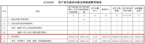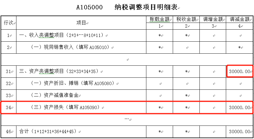 1.《中华人民共和国企业所得税年度纳税申报表(A类)》(A100000)第7行“资产减值损失”填列30000元: