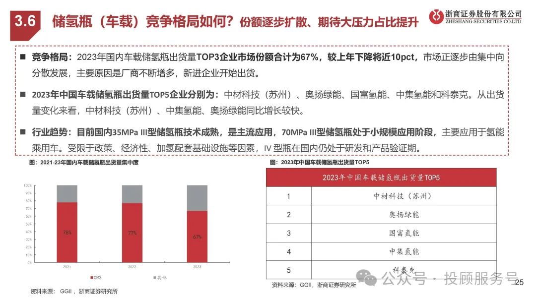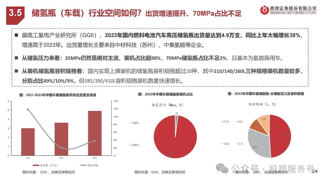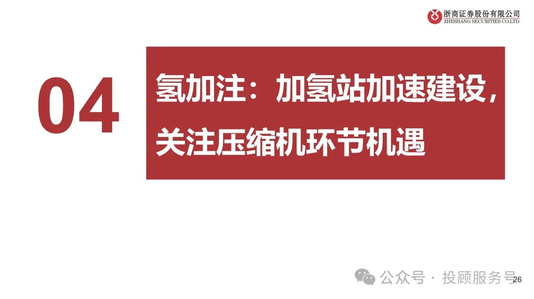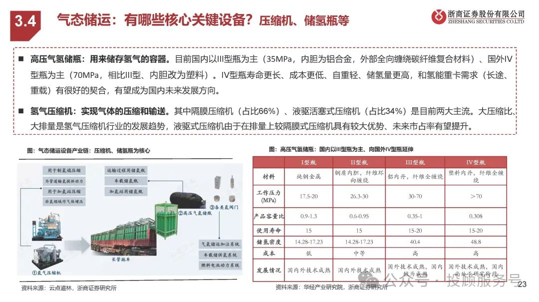 高压气氢储瓶:用来储存氢气的容器。目前国内以III型瓶为主(35MPa,内胆为铝合金,外部全向缠绕碳纤维复合材料)、国外IV 型瓶为主(70MPa,相比III型、内胆改为塑料)。IV型瓶寿命更长、成本更低、自重轻、储氢量更高,和氢能重卡需求(长途、 重载)有很好的契合,有望成为国内未来发展方向。氢气压缩机:实现气体的压缩和输送。其中隔膜压缩机(占比66%)、液驱活塞式压缩机(占比34%)是目前两大主流。大压缩比、 大排量是氢气压缩机行业的发展趋势,液驱式压缩机由于在排量上较隔膜式压缩机具有较大优势、未来市占率有望提升。