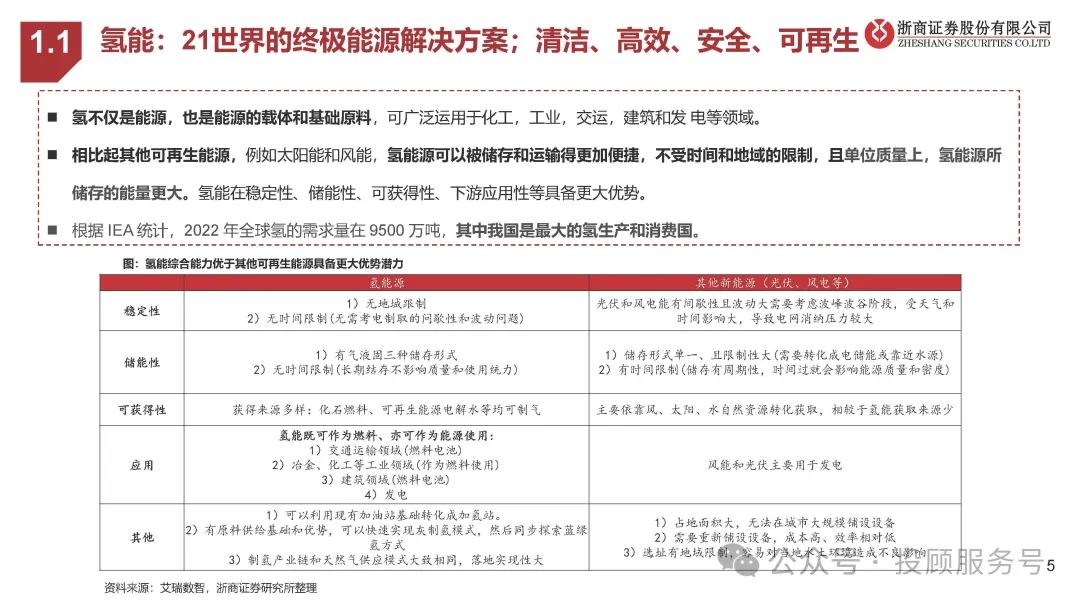 氢不仅是能源,也是能源的载体和基础原料,可广泛运用于化工,工业,交运,建筑和发 电等领域。相比起其他可再生能源,例如太阳能和风能,氢能源可以被储存和运输得更加便捷,不受时间和地域的限制,且单位质量上,氢能源所 储存的能量更大。氢能在稳定性、储能性、可获得性、下游应用性等具备更大优势。根据 IEA 统计,2022 年全球氢的需求量在 9500 万吨,其中我国是最大的氢生产和消费国。