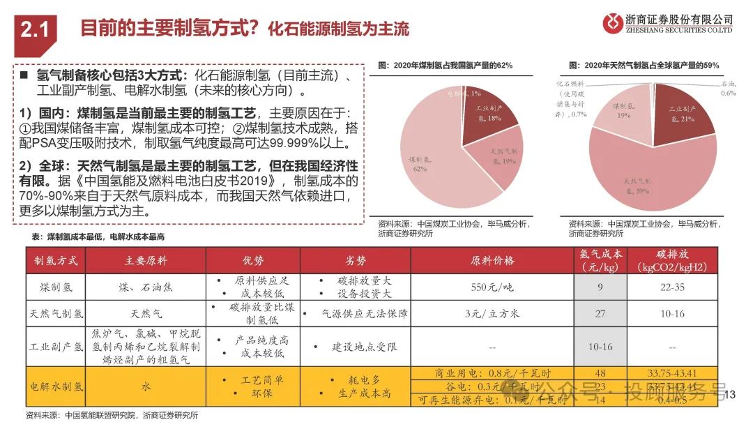 氢气制备核心包括3大方式:化石能源制氢(目前主流)、 工业副产制氢、电解水制氢(未来的核心方向)。1)国内:煤制氢是当前最主要的制氢工艺,主要原因在于:①我国煤储备丰富,煤制氢成本可控;②煤制氢技术成熟,搭 配PSA变压吸附技术,制取氢气纯度最高可达99.999%以上。2)全球:天然气制氢是最主要的制氢工艺,但在我国经济性 有限。据《中国氢能及燃料电池白皮书2019》,制氢成本的 70%-90%来自于天然气原料成本,而我国天然气依赖进口, 更多以煤制氢方式为主。