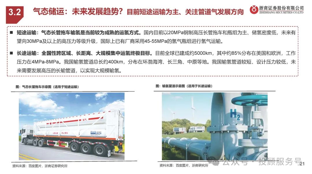 短途运输:气态长管拖车输氢是当前较为成熟的运氢方式。国内目前以20MPa钢制高压长管拖车和瓶组为主、储氢密度低,未来有 望向30MPa及以上的高压力等级升级,国际上已有厂商采用45-55MPa的氢气瓶组进行氢气运输。