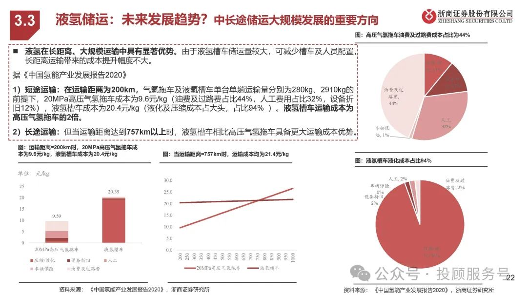 液氢在长距离、大规模运输中具有显著优势。由于液氢槽车储运量较大,可减少槽车及人员配置, 长距离运输带来的成本提升幅度不大。据《中国氢能产业发展报告2020》 1)短途运输:在运输距离为200km,气氢拖车及液氢槽车单台单趟运输量分别为280kg、2910kg的 前提下,20MPa高压气氢拖车成本为9.6元/kg(油费及过路费占比44%,人工费用占比32%,设备折 旧12%),液氢槽车成本为20.4元/kg(液化及压缩成本占大头,占比94% )。液氢槽车运输成本为 高压气氢拖车的2倍。2)长途运输:但当运输距离达到757km以上时,液氢槽车相比高压气氢拖车具备更大运输成本优势。