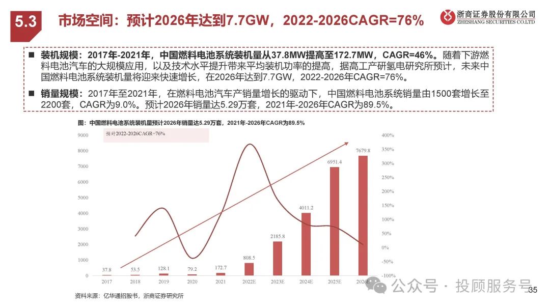 销量规模:2017年至2021年,在燃料电池汽车产销量增长的驱动下,中国燃料电池系统销量由1500套增长至 2200套,CAGR为9.0%。预计2026年销量达5.29万套,2021年-2026年CAGR为89.5%。