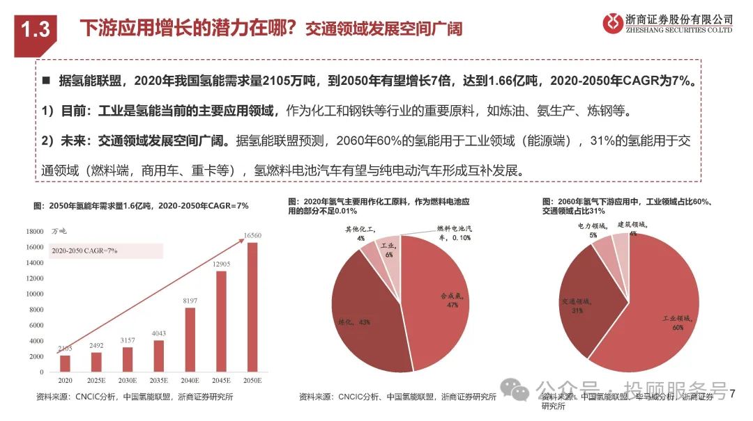 据氢能联盟,2020年我国氢能需求量2105万吨,到2050年有望增长7倍,达到1.66亿吨,2020-2050年CAGR为7%。1)目前:工业是氢能当前的主要应用领域,作为化工和钢铁等行业的重要原料,如炼油、氨生产、炼钢等。2)未来:交通领域发展空间广阔。据氢能联盟预测,2060年60%的氢能用于工业领域(能源端),31%的氢能用于交 通领域(燃料端,商用车、重卡等),氢燃料电池汽车有望与纯电动汽车形成互补发展。