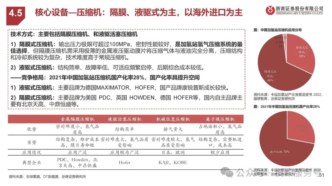 技术方式:主要包括隔膜压缩机、和液驱活塞压缩机 1)隔膜式压缩机:输出压力极限可超过100MPa,密封性能较好,是加氢站氢气压缩系统的最 佳选择,但隔膜压缩机需采用极薄的金属液压驱动膜片将压缩气体与液油完全分离,压缩结构 和冷却系统较为复杂,技术难度高于常规压缩机。2)液驱式压缩机:结构简单、故障率低、可适应频繁启停、后期综合成本较低。——竞争格局:2021年中国加氢站压缩机国产化率28%,国产化率具提升空间 1)液驱式压缩机:主要品牌为德国MAXIMATOR、HOFER,国产品牌康锐普斯成长较快。2)隔膜式压缩机:主要品牌为美国 PDC、英国 HOWDEN、德国 HOFER等,国内自主品牌主 要有北京天高、中鼎恒盛等。