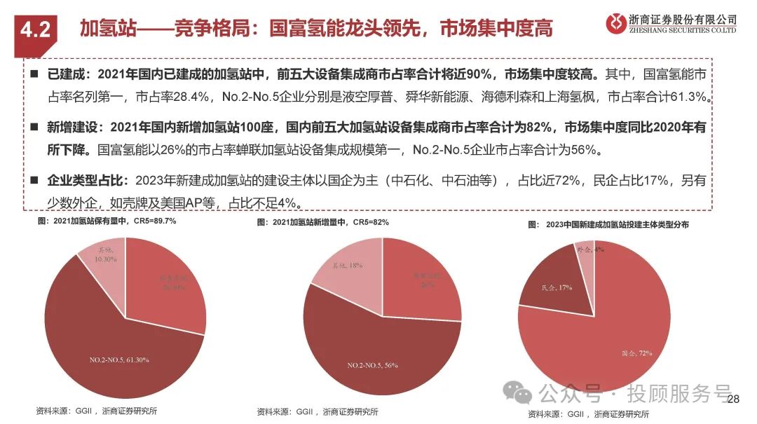 已建成:2021年国内已建成的加氢站中,前五大设备集成商市占率合计将近90%,市场集中度较高。其中,国富氢能市 占率名列第一,市占率28.4%,No.2-No.5企业分别是液空厚普、舜华新能源、海德利森和上海氢枫,市占率合计61.3%。新增建设:2021年国内新增加氢站100座,国内前五大加氢站设备集成商市占率合计为82%,市场集中度同比2020年有 所下降。国富氢能以26%的市占率蝉联加氢站设备集成规模第一,No.2-No.5企业市占率合计为56%。企业类型占比:2023年新建成加氢站的建设主体以国企为主(中石化、中石油等),占比近72%,民企占比17%,另有 少数外企,如壳牌及美国AP等,占比不足4%。