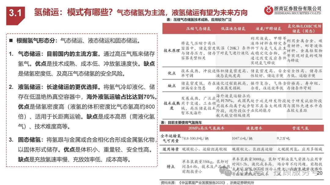 根据氢气形态分:气态储运、液态储运和固态储运。1. 气态储运:目前国内的主流方案。通过高压气瓶来储存 氢气。优点是技术成熟、成本低、冲放氢速度快。缺点 是储氢密度低、及高压气态储氢的安全风险。2. 液氢储运:长途储运的更优选择。将氢气冷却液化、储 存在低温绝热真空容器中,海外液氢运输占比达到70%。优点是储氢密度高(液氢的体积密度比气态氢高约800 倍)、适用于长距离运输。缺点是成本高昂(需液化氢 气)、技术难度高等。3. 固态储氢:将氢跟与金属或合金相化合形成金属氢化物, 以固体形式储存。优点是体积小、重量轻、安全性高。缺点是充放氢速率慢、充放效率低、成本高等。