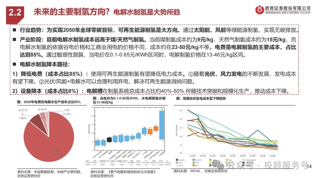 行业趋势:为实现2050年全球零碳目标,可再生能源制氢是大方向。通过太阳能、风能等绿能源制氢,实现无碳排放。产业阶段:目前电解水制氢成本远高于煤/天然气制氢。当前煤制氢成本约为9元/kg,天然气制氢成本约为15元/kg,而 电解水制氢的依据谷电价格和工商业用电的价格不同,成本约在23-50元/kg不等。电费是电解制氢的主要成本、占比 达到85%。通过敏感性测算、当电价在0.1-0.65元/KWh区间时,电解制氢价格在13-46元/kg区间。电解水制氢降本路径:1)降低电费(成本占比85%):使用可再生能源制氢有望降低电力成本。①随着光伏、风力发电的不断发展,发电成本 有望下降。②光伏/风能+电解水可以合理利用弃电,解决可再生能源消纳问题。2)设备降本(成本占比8%):电解槽在制氢系统总成本占比约40%-50%,伴随技术突破和规模化生产,推动成本下降。