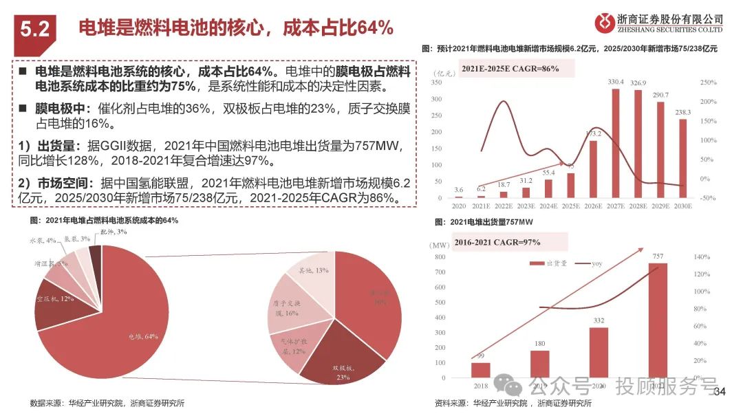 电堆是燃料电池的核心,成本占比64%