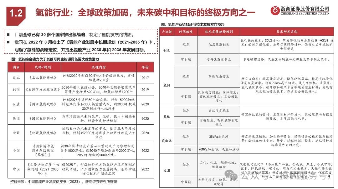 目前全球已有 30 多个国家推出氢战略、制定了氢能发展路线图。我国在 2022 年 3 月推出了《氢能产业发展中长期规划(2021-2035 年)》, 明确了氢能的战略定位,并提出氢能产业 2030 年和 2035 年发展目标。