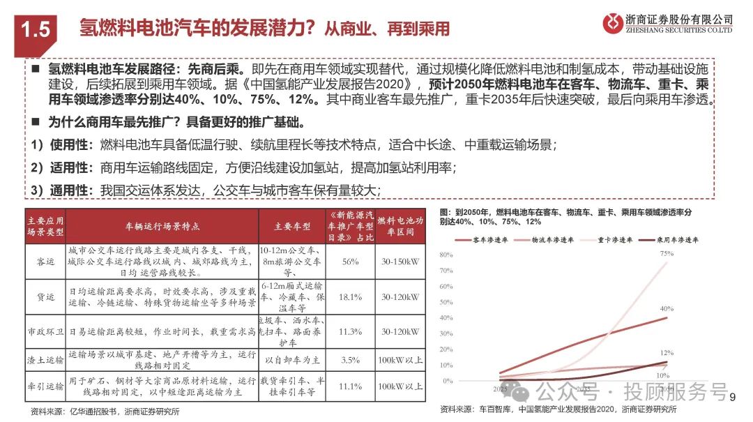 氢燃料电池车发展路径:先商后乘。即先在商用车领域实现替代,通过规模化降低燃料电池和制氢成本,带动基础设施 建设,后续拓展到乘用车领域。据《中国氢能产业发展报告2020》,预计2050年燃料电池车在客车、物流车、重卡、乘 用车领域渗透率分别达40%、10%、75%、12%。其中商业客车最先推广,重卡2035年后快速突破,最后向乘用车渗透。