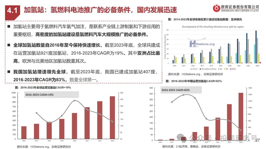 加氢站主要用于氢燃料汽车氢气加注,是联系产业链上游制氢和下游应用的 重要枢纽,高密度的加氢站建设是氢燃料汽车大规模推广的必备条件。全球加氢站数量自2016年至今保持快速增长。截至2023年底,全球共建成 在运营加氢站921座加氢站,2016-2023年CAGR为19%。其中亚洲占比最 高,欧洲与北美地区加氢站数量其次。我国加氢站增速领先全球,截至2023年底,我国已建成加氢站407座, 2016-2023年CAGR为83%,数量全球第一。