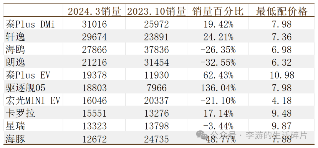 在第一期的生活碎片中我们分享了比亚迪的销量和利润数据,简单回顾一下:一季度销量61.2万辆,扣非净利润37.5亿,粗估单车净利润6100元。23年销量304.5万辆,扣非284.6亿,粗估单车净利润9300元。比亚迪一季度推出荣耀版促销,单车降至少1万,标杆车型秦plus DMi最低售价来到7.98万。当时的切入点是当行业大佬比亚迪降价时,会给竞争对手带来怎样的销量影响。本周我们选取12万以下轿车3月销量前十的车型,进行数据对比: