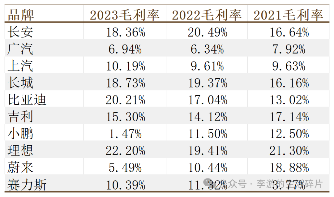 笔者所在的汽车行业极有可能成为下一个支柱性产业之一,充分的竞争,让行业变得充分的内卷,也带来了越来越透明的车价构成。接着来分享几组公开市场数据,来看一下各家上市车企的毛利率变化: