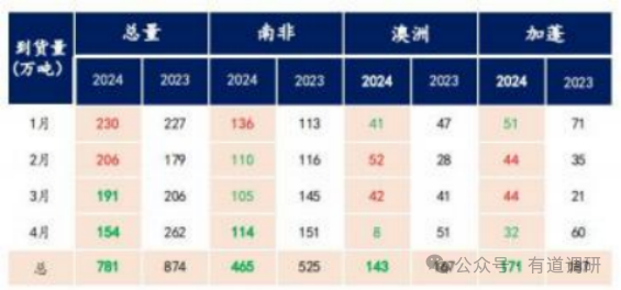 2024年 1-4 月,到货总量 781 万吨,同比-10.6%;1-4 月澳洲到货量 143 万吨,同比-14.4%。