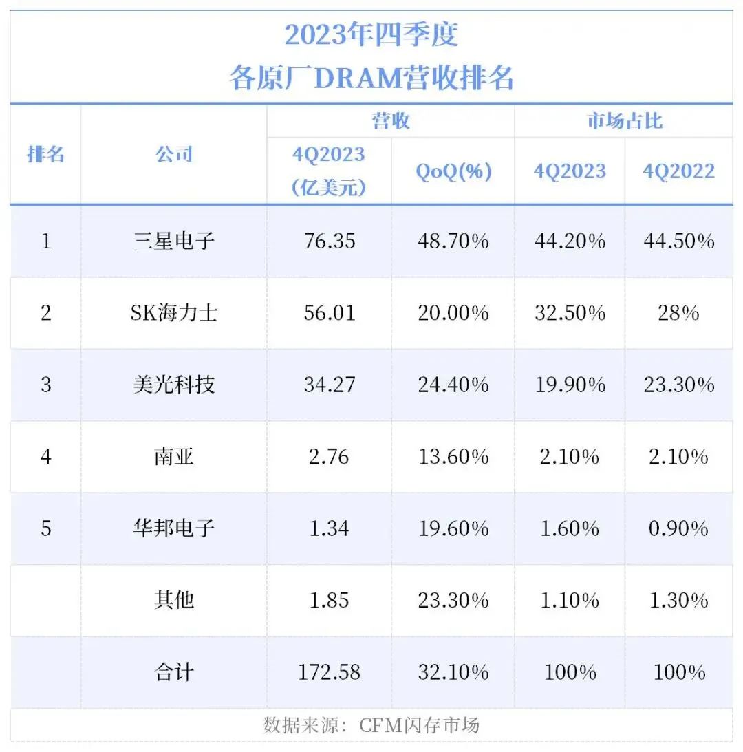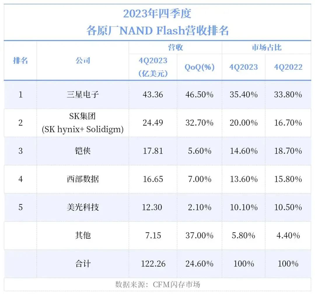 2023年四季度,全球存储市场呈现增长趋势,首次恢复同比增长。主要得益于减产策略的成功和下半年需求的回温。三星电子在DRAM和NAND Flash市场的营收季度涨幅显著,分别为48.7%和46.5%。DRAM市场中,SK海力士逐渐缩小与三星电子的差距,市场份额差距缩小至11.7个百分点。NAND Flash市场方面,SK海力士连续两个季度超过铠侠,市占率扩大至20%。