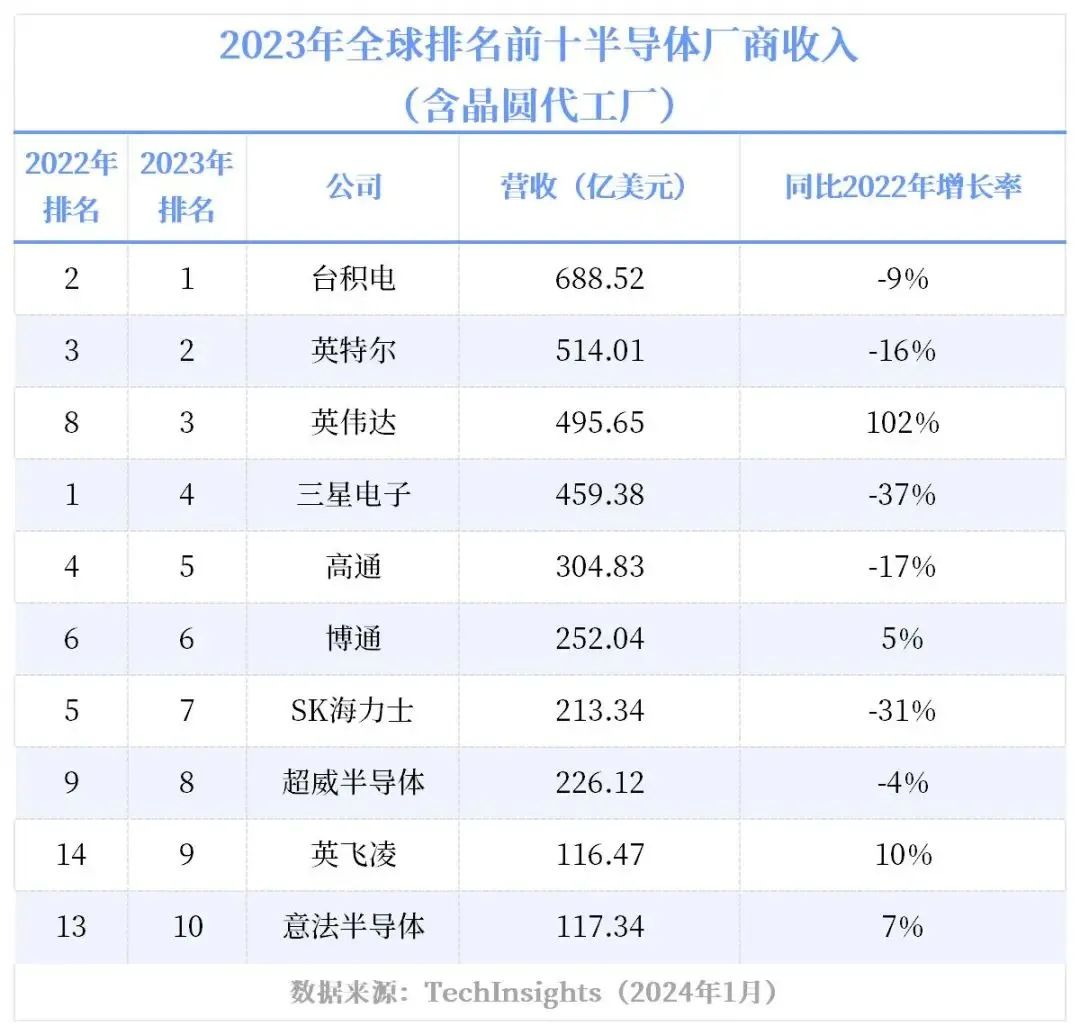 此外,汽车市场的高需求推动了相关公司如意法半导体(Gartner榜单)和英飞凌(TechInsights榜单)的成长,使它们进入前十。然而,模拟芯片市场受到价格战和库存高企的影响,导致德州仪器排名下滑,甚至跌出前十(TechInsights榜单)。