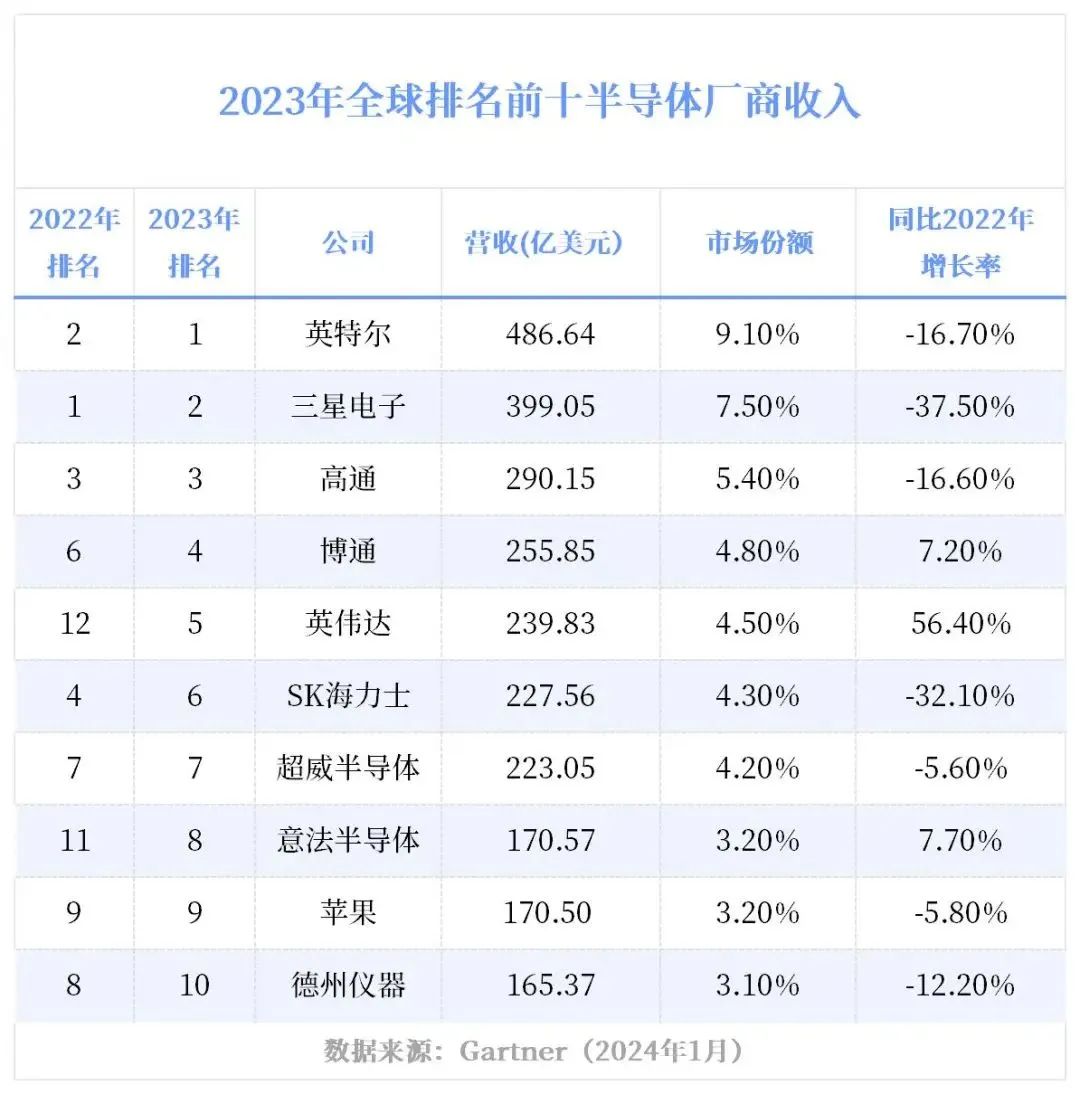 英特尔在Gartner榜单中重返第一,主要得益于其收入降幅相对较小,而三星的收入同比下降了约四成。从排序变化上看,存储业务衰退而AI需求增长成为显著趋势。存储业务厂商(如三星、SK海力士)普遍收入承压,排名下滑;而英伟达因AI需求的快速发展首次进入前五,博通排名也有所提升。