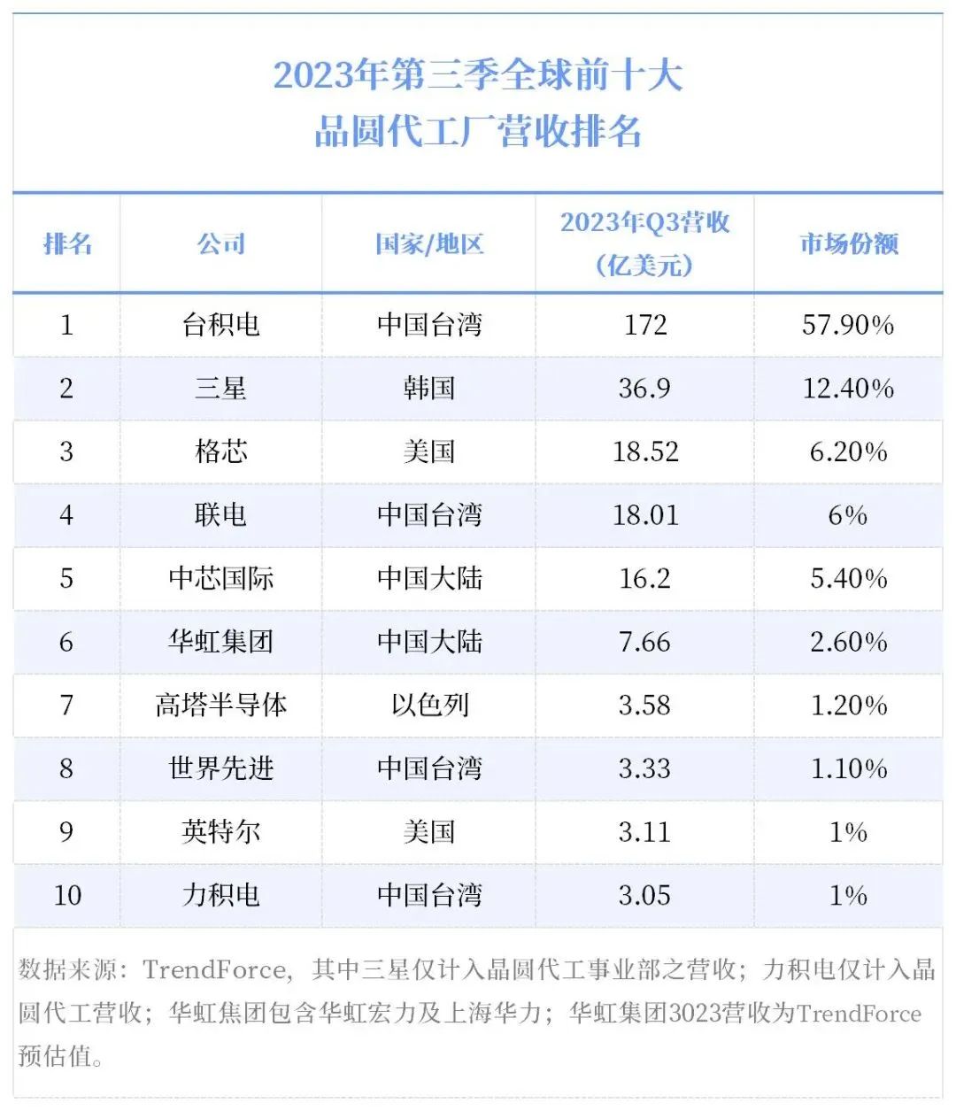 在2023年第三季度,台积电在全球晶圆代工市场的市占率高达近58%,几乎是排名第二的三星的5倍,显示出其在该领域的绝对领导地位。同时,榜单前六名的市场格局基本保持稳定,表明这些企业在晶圆代工市场中的竞争力较强。