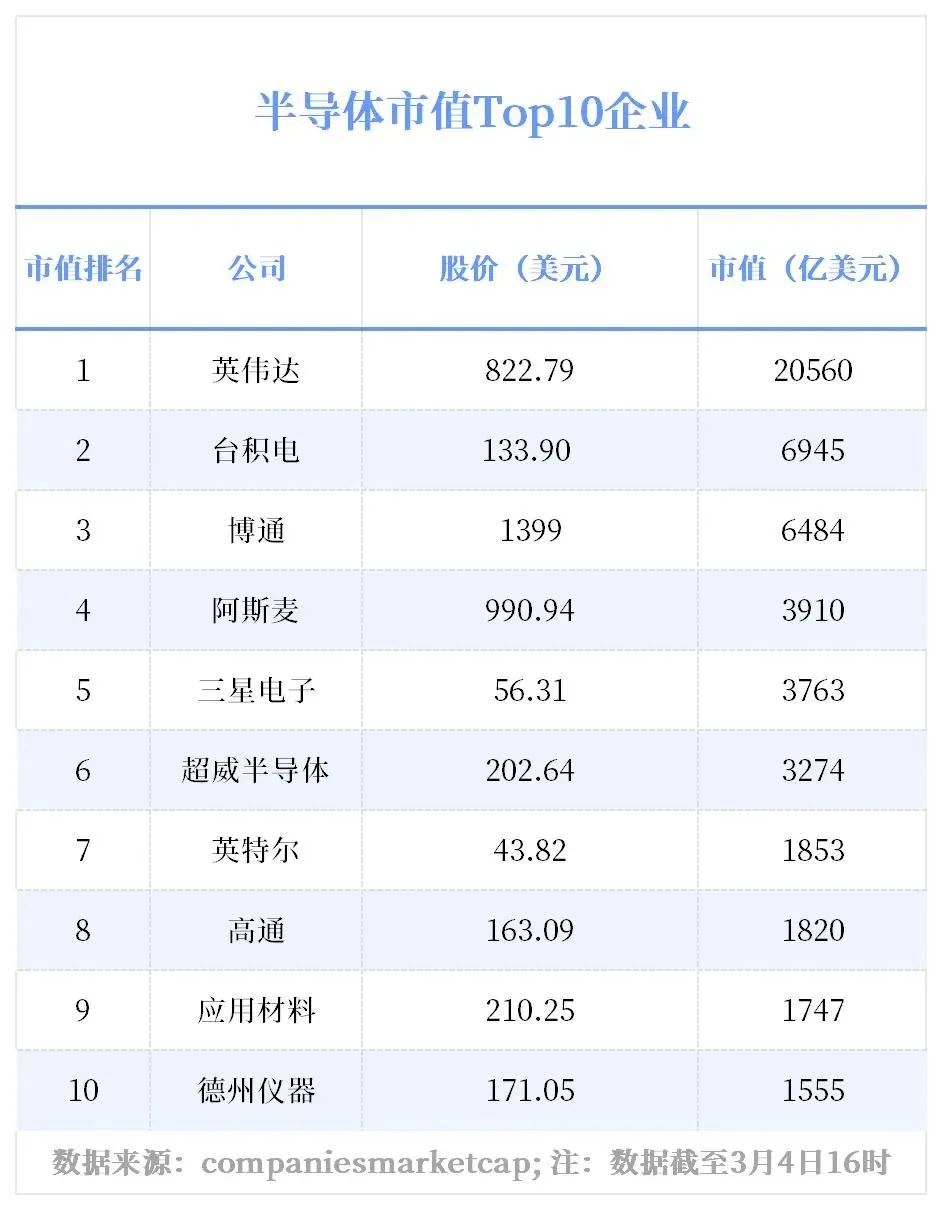 台积电作为芯片代工巨头,市值虽不及英伟达,但其在制程技术和产能方面仍保持领先地位。其他企业如博通、阿斯麦、三星电子等也位列市值前十,显示了半导体行业的多元化发展趋势。然而,市值增长方面,德州仪器是前十中唯一股价涨幅较小的企业,凸显了不同企业间的市场表现差异。随着技术的不断进步和市场的不断变化,全球半导体行业的竞争格局将持续演变。