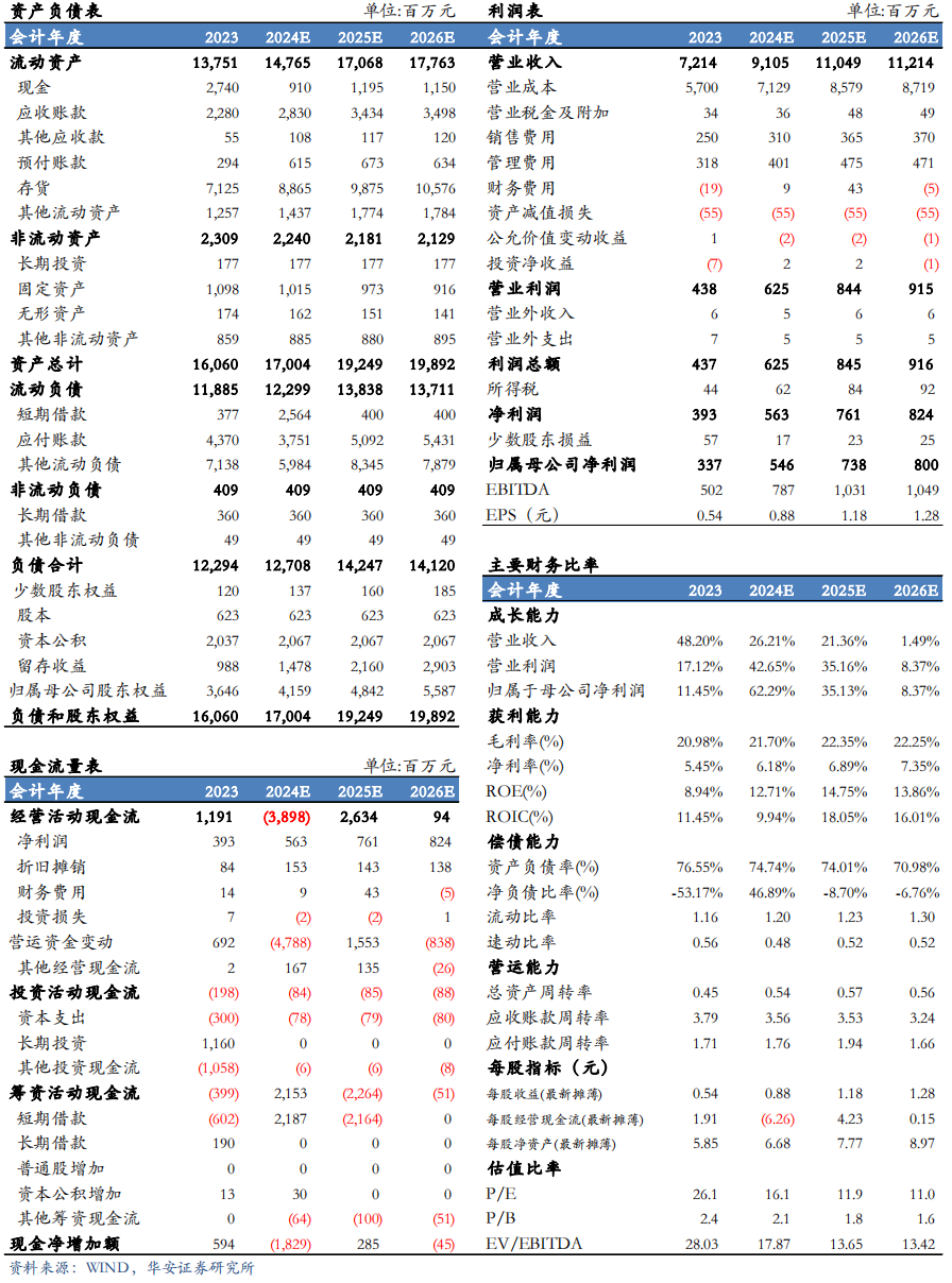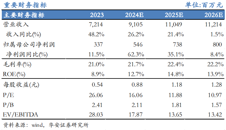 考虑公司在手订单充裕,但整体毛利率稳定,出于审慎考虑,我们调增收入,调减利润率,预测公司2024-2026年营业收入分别为91.05 /110.49/112.14亿元(2024-2025年调整前为77.92/86.20亿元),归母净利润分别为5.46/7.38/8.00亿元(2024-2025年调整前为6.30/8.08亿元),以当前总股本6.23亿股计算的摊薄EPS为0.88/1.18/1.28元。公司当前股价对2024-2026年预测 EPS的PE 倍数分别为16/12/11倍,维持“买入”评级。