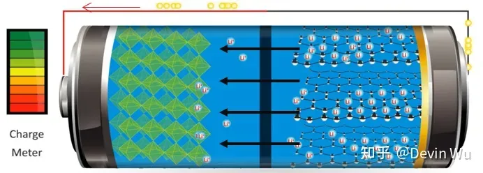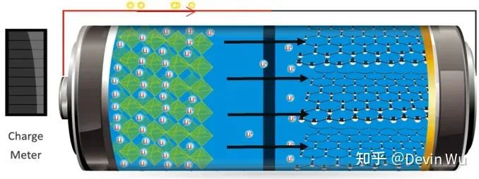 当对电池进行充电时,电池的阴极上有锂离子生成,生成的锂离子经过电解液运动到阳极。而作为阳极的碳呈层状结构,它有很多微孔,到达阳极的锂离子就嵌入到碳层的微孔中,嵌入的锂离子越多,充电容量越高。