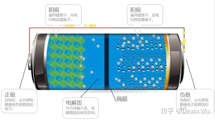 充满电的锂电池,锂离子嵌入在阳极材料上,阳极(负极)碳呈层状结构,有很多微孔,锂离子就嵌入在碳层的微孔中。放电时,Li+通过隔膜从阳极移动到阴极,电子无法通过隔膜,只能通过外面电路的负极移动到正极。(电子带负电,电子方向是负极到正极,电流方向就是正极到负极。)