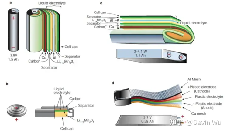 不同形状锂离子电池的构成示意图a圆柱型;b纽扣型;c棱柱型;d薄膜平板型