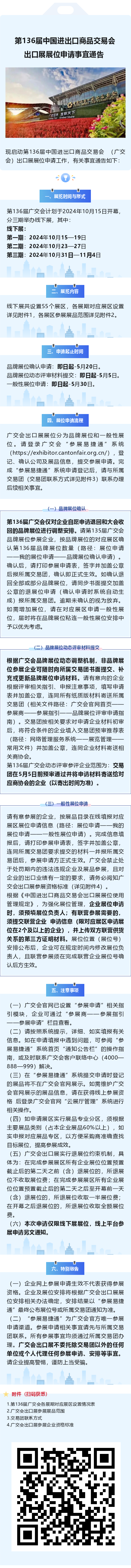 2024年5月1日,中国进出口商品交易会业务办公室发布了《关于第136届广交会出口展展位申请事宜的通告》。