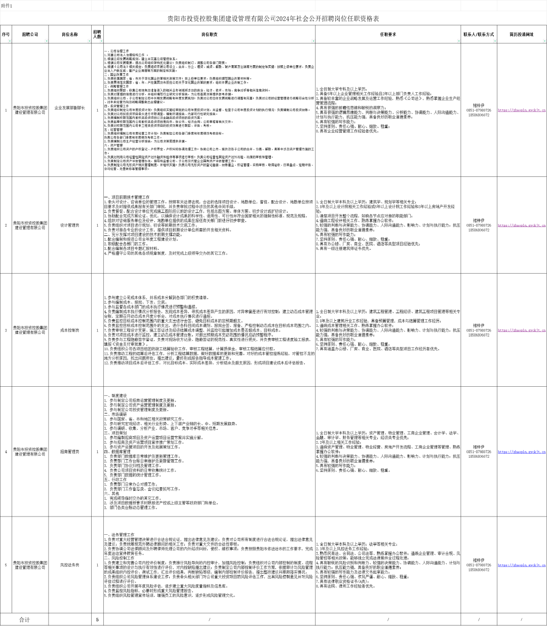 具体岗位职责和任职要求详见附件《贵阳市投资控股集团建设管理有限公司2024年社会公开招聘岗位任职资格表》,任职条件计算年龄、工作年限、任职年限或取得专业技术职称时间计算日截止于报名截止之日。