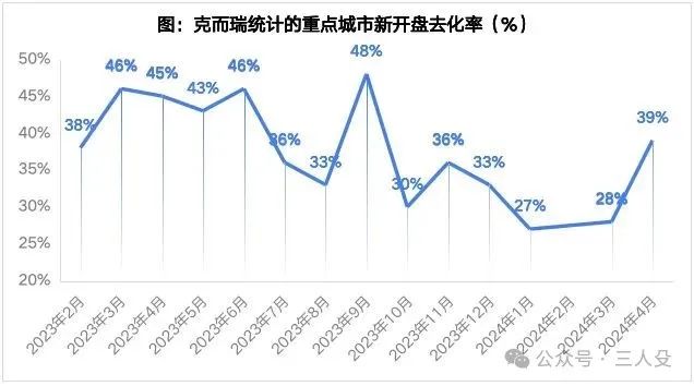 新开盘去化率都降至28%了,4月份稍微回升至39%,像上海外滩壹号院这样的日光盘,仅仅是极个别的现象。下面是新开盘的去化率的折线图: