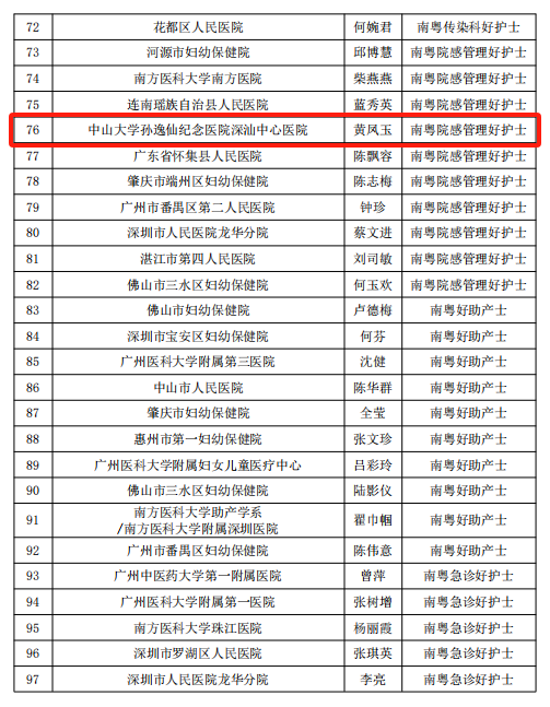 2024年5月5日,广东省护士协会公布了开展第三届“南粤好护士”评选结果,其中,中山大学孙逸仙纪念医院深汕中心医院(深汕院区)消毒供应中心科护士长黄凤玉荣获“南粤院感管理好护士”称号。这是在汕尾市卫生健康局的大力支持下,在深汕院区党政领导的高度重视下,院区护理团队致力于提升护理工作质量,助力院区实现高质量发展的充分体现。