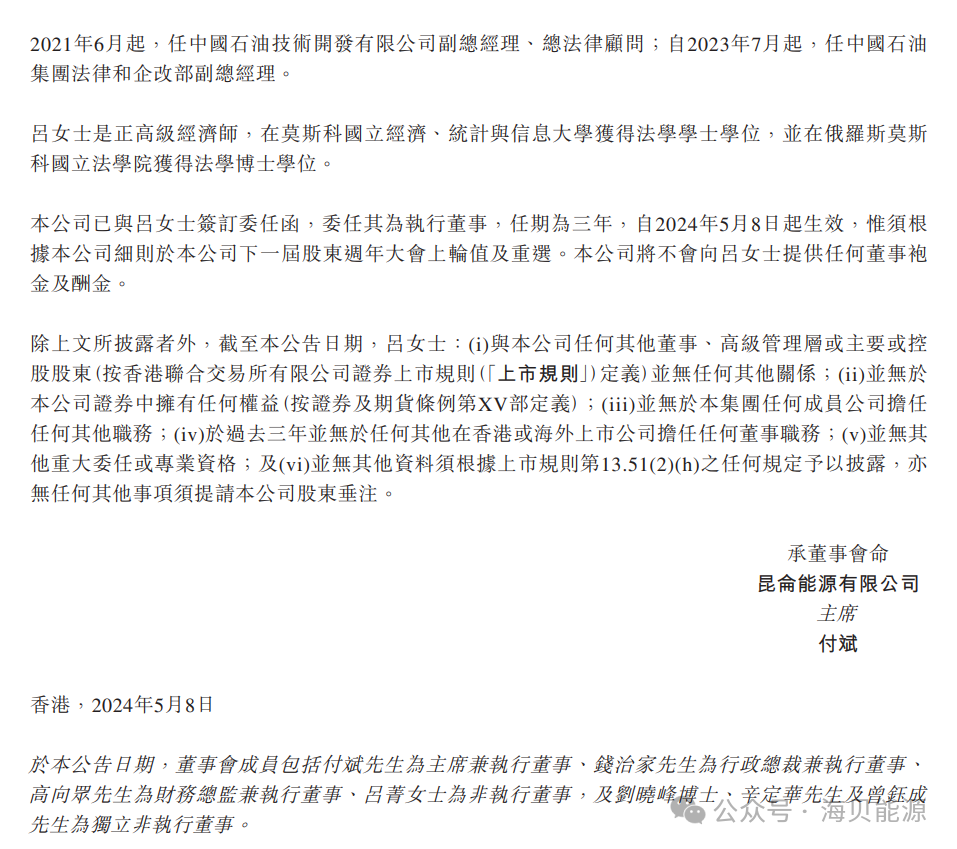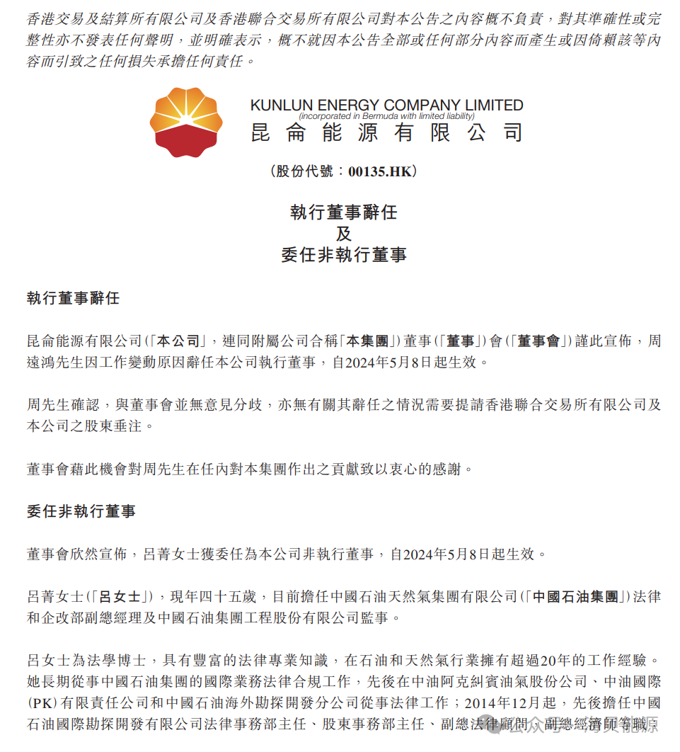 昆仑能源(00135)发布公告,周远鸿因工作变动原因