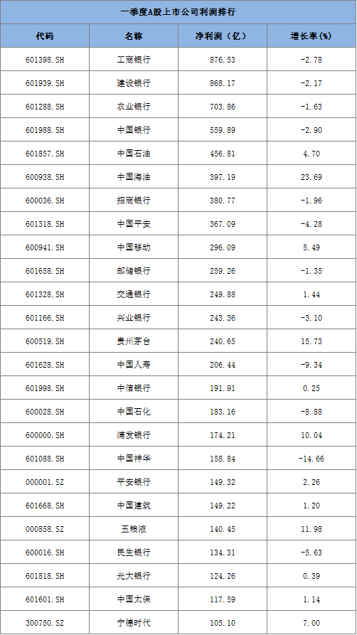 一季度,工商银行、建设银行、农业银行分列盈利榜单前三,工商银行一季度归母净利润达876.53亿元,成为A股最赚钱的公司,建设银行、农业银行、中国银行,分别实现归母净利润868.17亿元、703.86亿元和559.89亿元,分列第二、三、四位。